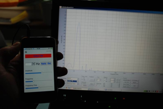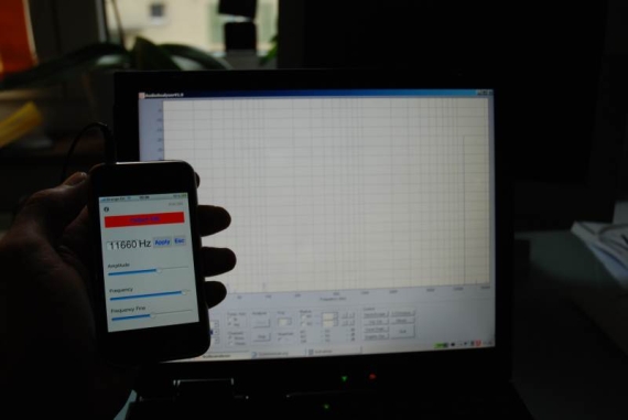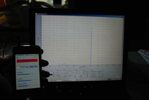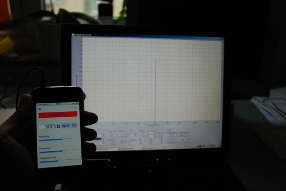 The screen in the background shows you the frequency spectrum of the iPhone audio output.